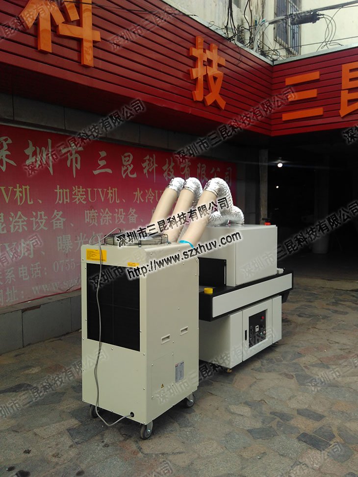 uv固化爐,旁邊的風冷輸送機是客戶提供的。這款移動式冷氣機SAG-65是三出氣口對
